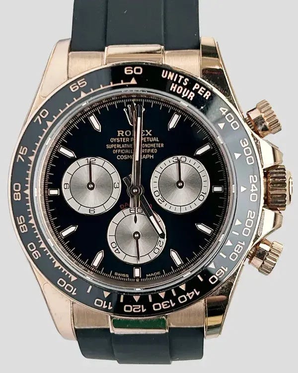 At auction, a 2025 Rolex Cosmograph Daytona (ref. 126515LN) was up for grabs on Grailzee. This rose gold, black dial beauty with an Oysterflex strap with protective stickers intact and box/papers dated May 2025 got bid to $41,200 - not enough to close the deal or meet the reserve. As expected there was a rush of last-minute bids—because nothing says fiscal irresponsibility quite like winning a Daytona on a Monday.