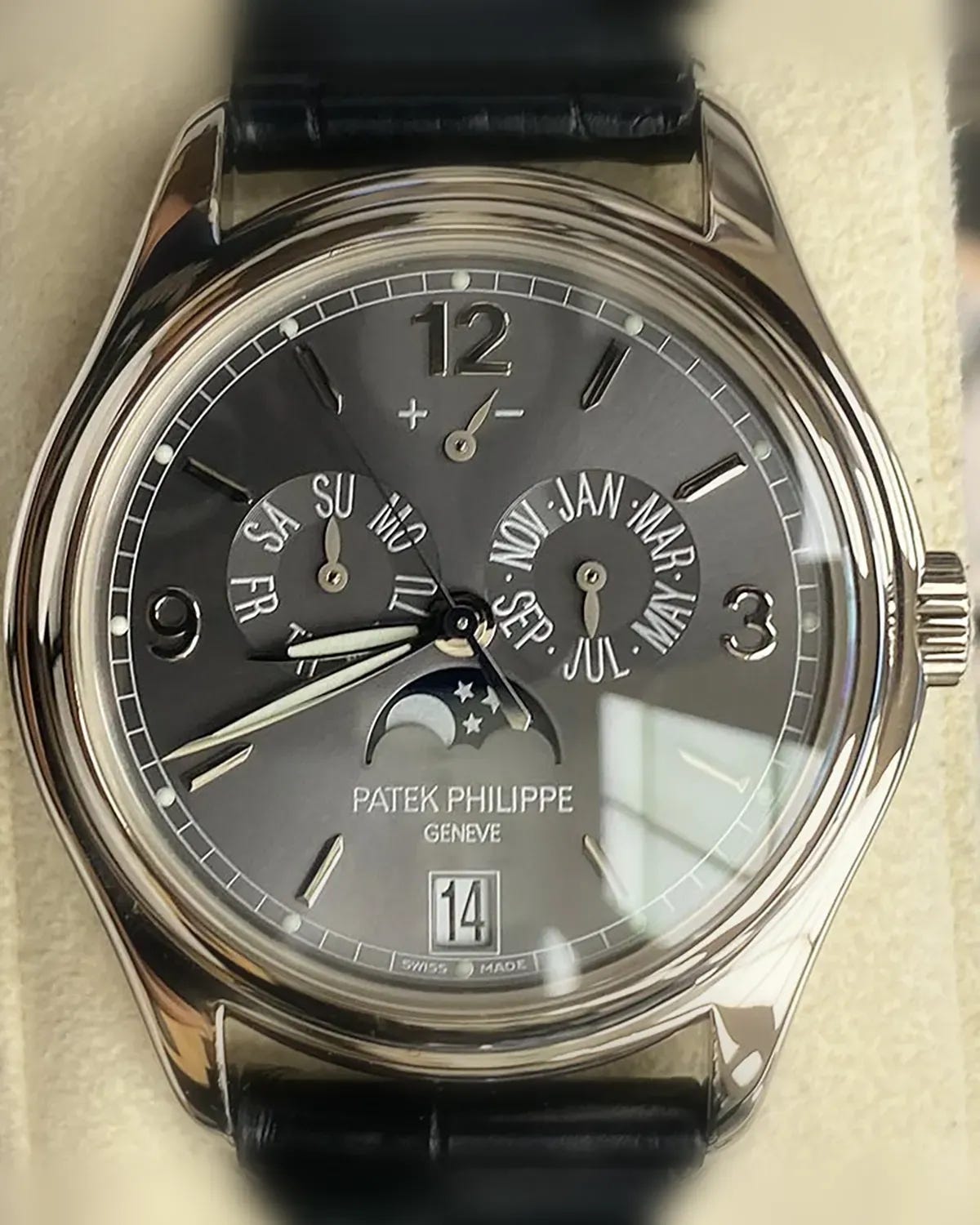 On the wrist, the 39 mm case and slim profile are exactly why collectors keep circling back to the 5146: dressy enough for black tie, casual enough for a Tuesday. The grey dial in this -010 execution is the sweet spot—tonal, restrained, and wonderfully forgiving under different light. If you’re a spec hawk, you’re getting white gold, automatic winding, annual calendar with moonphase, power reserve, and 30 m water resistance, which is plenty for life’s champagne risks and zero for dishwashing.