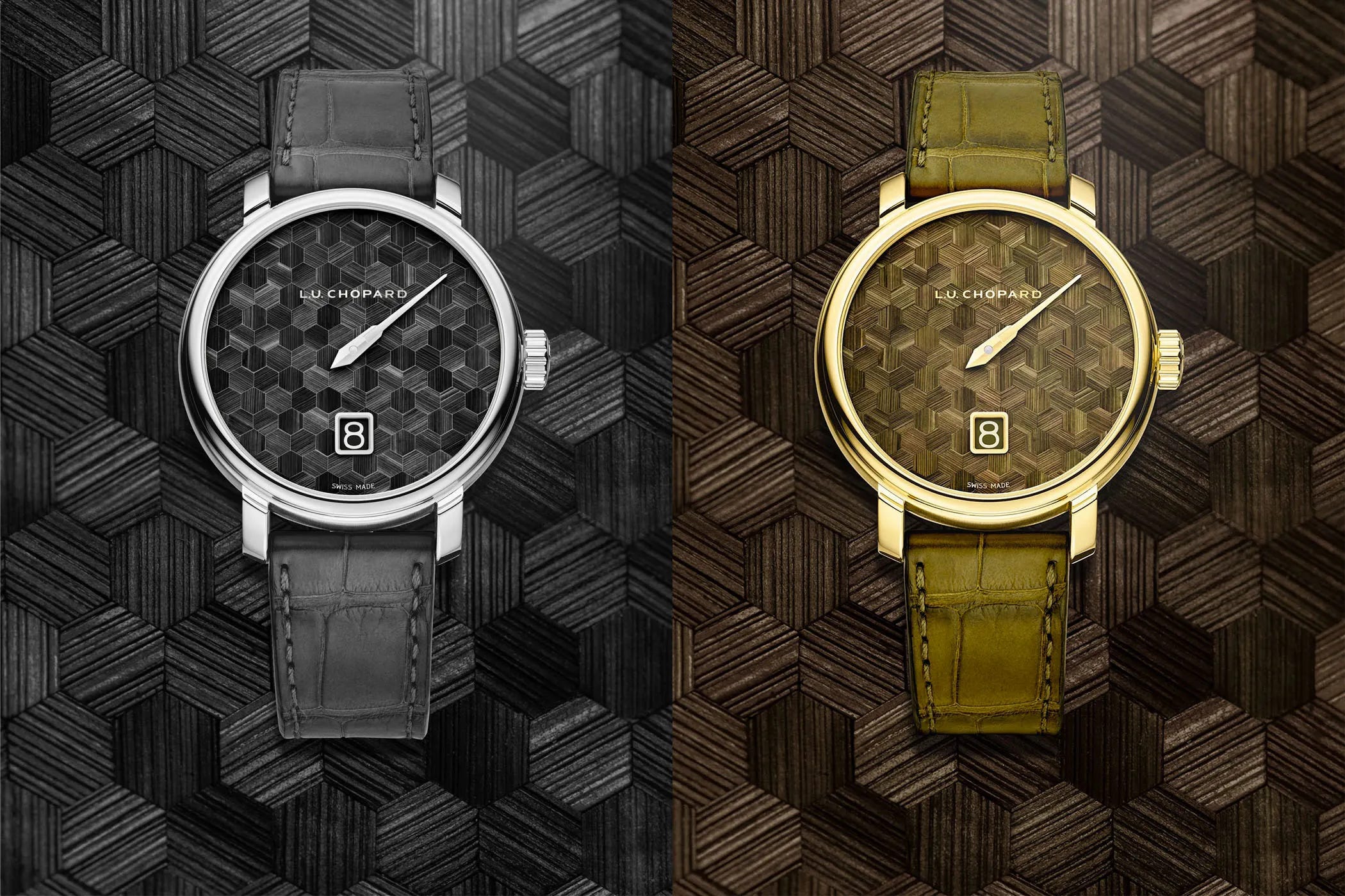 Two ultra-limited editions, in 18k ethical yellow or white gold, feature honeycomb straw marquetry dials and the L.U.C 98 calibre with an eight-day power reserve. The 40mm cases blend satin-brushed and polished finishes, while the jumping hour complication remains a centerpiece. Hand-crafted straw dial work matches each precious metal variant in tone and character. Limited to eight pieces per version, they are boutique exclusives priced at EUR 73,400.