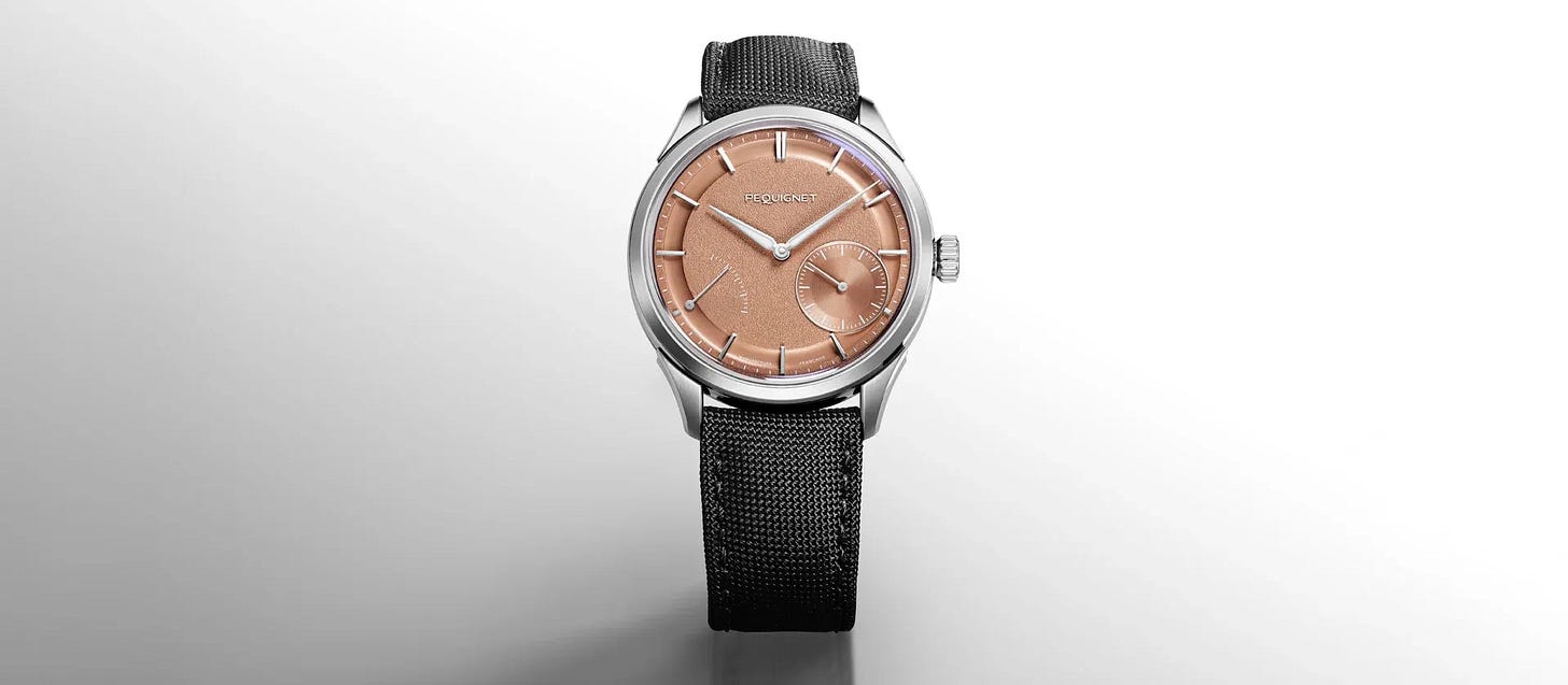 Pequignet showcases French Haute Horlogerie with a textured coral dial featuring power reserve and small seconds. The 39.5 mm steel case frames the in-house Calibre Royal, boasting a remarkable 96-hour power reserve. Polished hands filled with blue Super-LumiNova elevate legibility and visual flair. Paired with a black Cordura strap, it underscores French watchmaking’s rising profile.