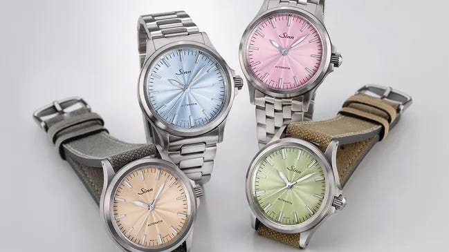 Sinn expands the 556 range with four guilloché pastel dials—Sand, Ice Blue, Mauve, and Sage—balancing practicality and refinement. The 38.5 mm steel cases are rated to 200 m and house the Sellita SW200-1 with a 38-hour reserve. Each colorway is limited to 300 pieces. Pricing runs from €1,450 on canvas-Alcantara up to €1,800 on a micro-adjust steel bracelet.