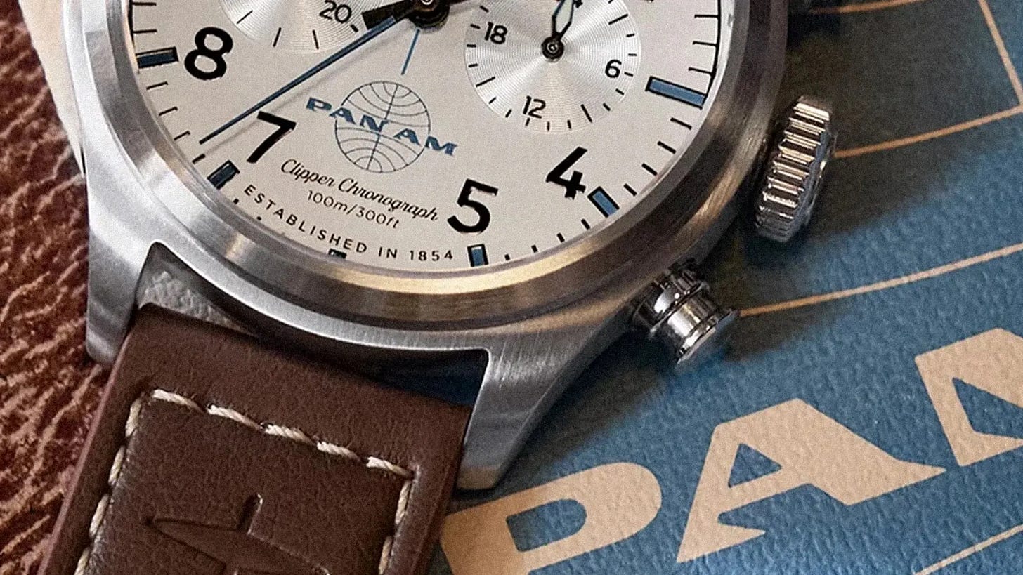 Timex x Pan Am Waterbury Ace arrives as a chronograph ($269, quartz) and an automatic ($349) inspired by midcentury aviation and Pan Am iconography. The automatic features an exhibition caseback and leather strap with airplane icon, while both use signature coloring and a plane silhouette at 12 o’clock. Pre-orders are open for the vintage-styled duo. It’s a nostalgic, attainable nod to the golden age of flight.