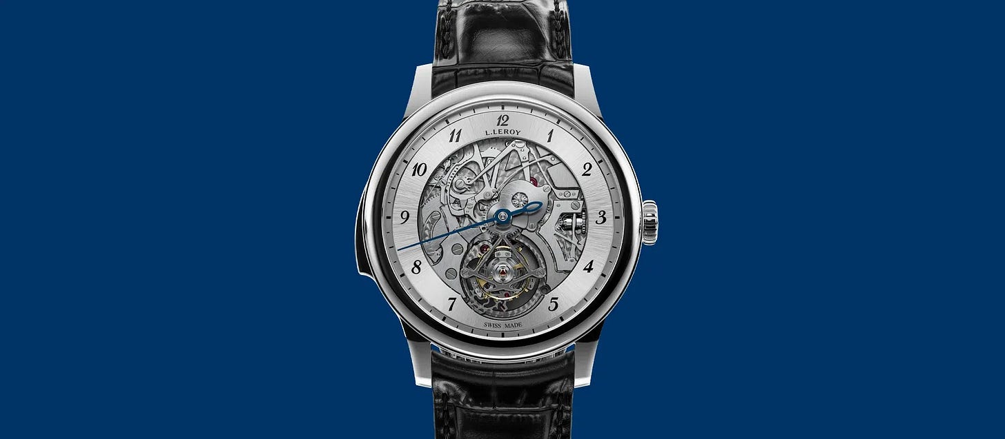 Osmior Bal du Temps unites a minute repeater with a flying tourbillon to demonstrate 240 years of L. Leroy savoir-faire. A single blue hand indicates time on a refined silver-toned dial, emphasizing purity and balance. Calibre L601SQ features a variable-inertia balance and high-end finishing for precision and beauty. Offered in platinum, 18k 5N red gold, or Grade 5 titanium, it epitomizes modern Haute Horlogerie.