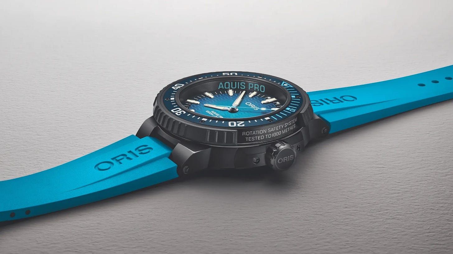 The Aquis Pro 1000M arrives as Oris’s most advanced dive watch, developed alongside professional divers. A blue gradient wave dial and Super-LumiNova ensure clarity underwater, supported by the Rotation Safety System to prevent accidental bezel moves. The gray-PVD titanium case measures 49.50mm and comes with interchangeable rubber straps. Powered by the Oris 733 automatic, it offers a 41-hour reserve and serious 1000m water resistance.