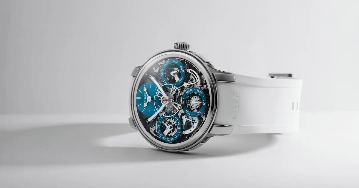 To celebrate the 75th anniversary of Ahmed Seddiqi & Sons, MB&F presents two ultra-limited LM Perpetual models: a diamond-set Baguette in steel and the sportier EVO in titanium. Both are powered by Stephen McDonnell’s integrated perpetual calendar with a 72-hour power reserve, showcasing signature three-dimensional architecture. The Baguette dazzles with 48 baguette-cut diamonds and a turquoise dial, while the EVO leans into lightweight durability with vivid blue accents. Production is capped at five and seven pieces respectively.
