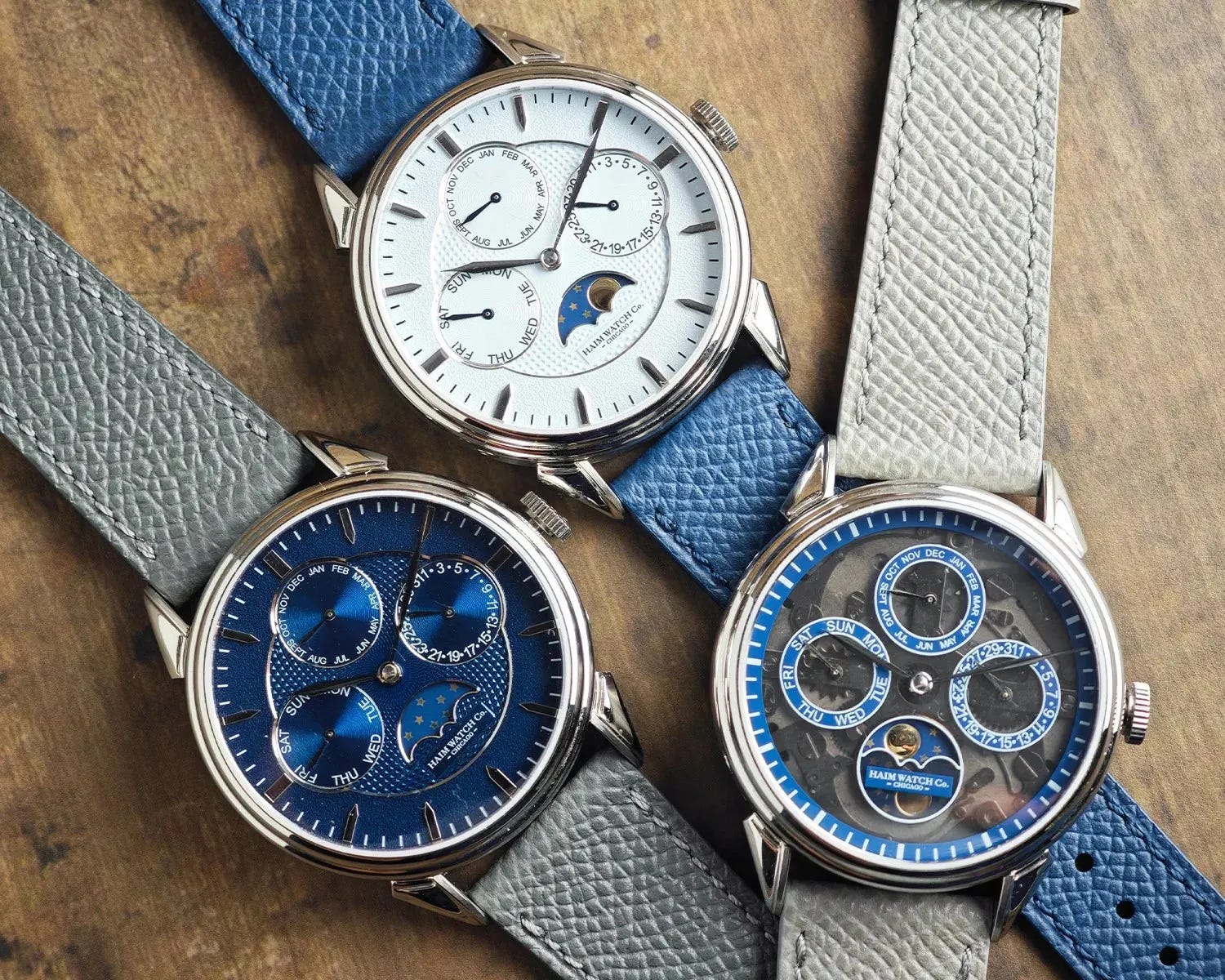 The Haim Annum brings a full calendar and moonphase to an approachable price point. Based on a Miyota automatic, the proprietary movement drives month, date, day, and moonphase via four subdials with dedicated pushers. The 38mm steel case features mixed finishing, sapphire crystals, and an exhibition back. Retail is $2,150 with pre-orders at $1,650.