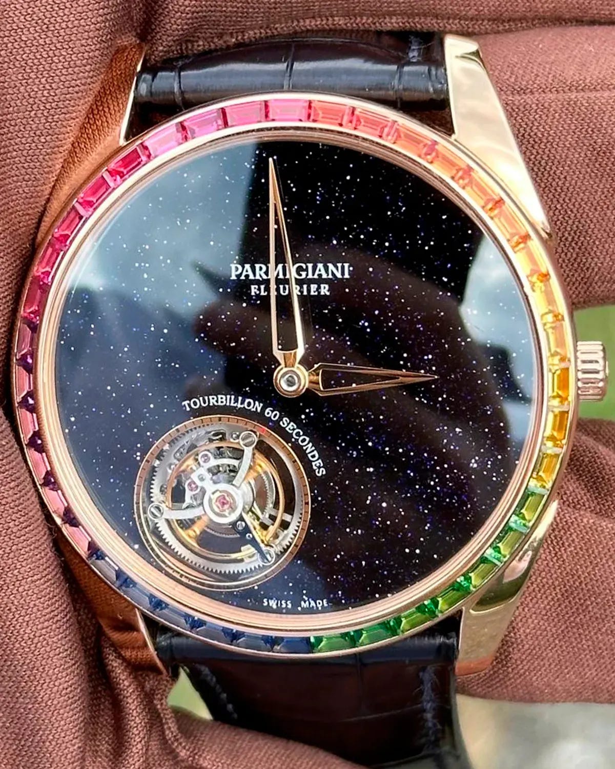 From a horological standpoint this watch is nothing short of spectacular. It features a 40.2 mm rose gold case, delivered with a bezel set in multi-colored baguette gemstones—rubies, sapphires, tsavorites and amethysts—forming what the brand describes as a “moonbow” halo around an aventurine dial. The movement is the ultra-thin automatic calibre PF517 with a flying tourbillon positioned between 7 and 8 o’clock—a subtle homage to Michel Parmigiani’s own birth time of 7:08 am. The aventurine dial evokes a starry night sky, while the rainbow gemstone bezel references the lunar-rainbow phenomenon (“moonbow”), giving the watch a poetic narrative.
