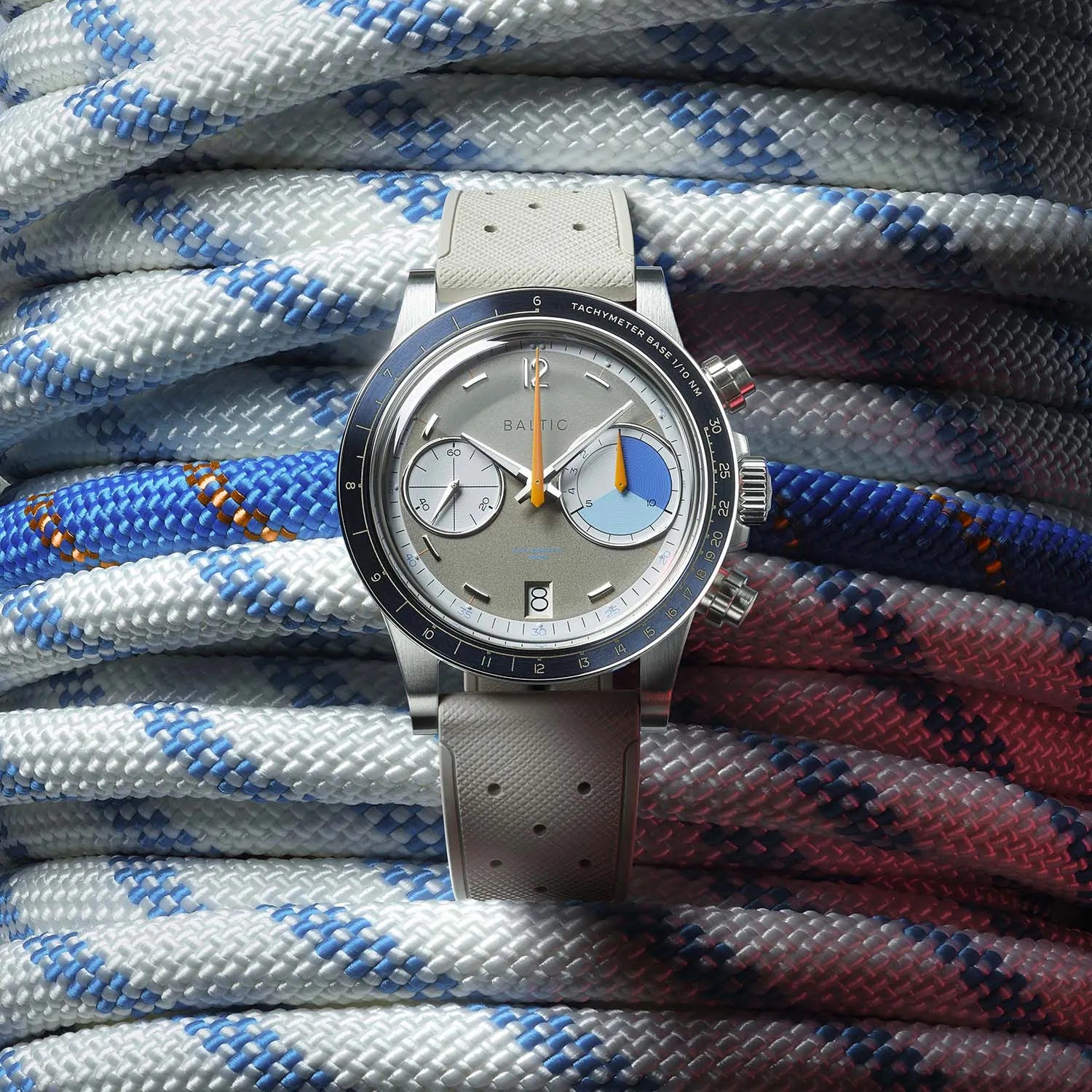 Baltic celebrates its role as Official Timekeeper of the Transat Café L’Or race with a 200-piece limited chronograph. The compact steel case frames a regatta-inspired blue tachymeter bezel and a metallic champagne bi-compax dial. Inside is the hand-wound Sellita SW511 BH with a 63-hour power reserve. It ships on a beads-of-rice bracelet with an extra off-white FKM rubber strap, priced at EUR 1,750 before tax or EUR 2,100 including EU taxes.