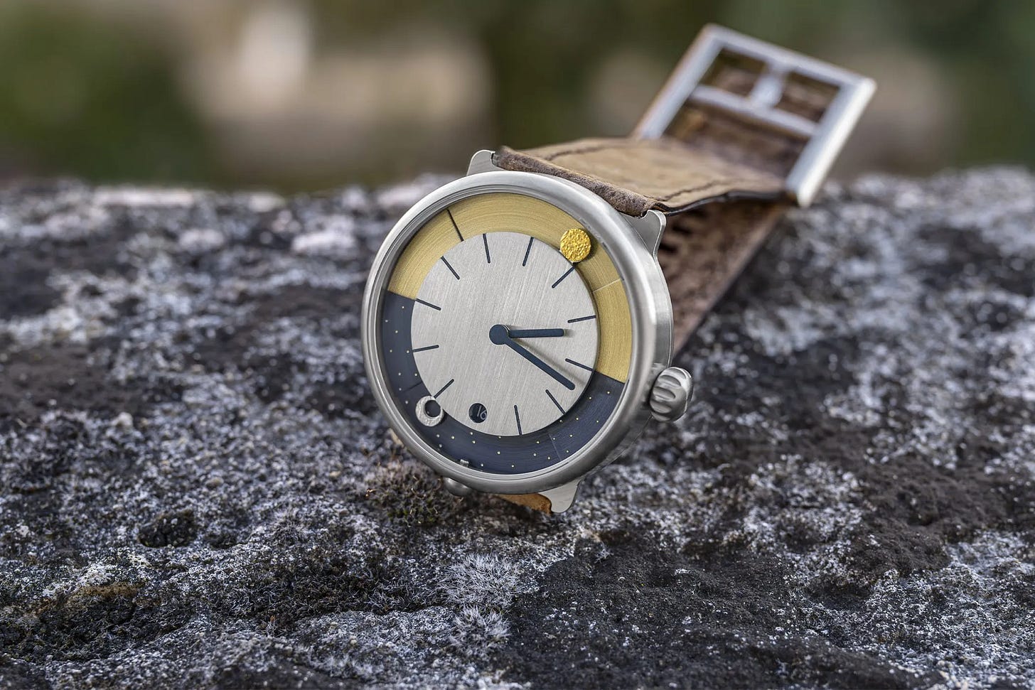 Inspired by 1953 Himalayan mountaineering, this hand-wound field watch is built for altitude with a 40mm case, sapphire crystal, and 100m water resistance. Its textured, snowflake-like dial comes in colors referencing glacial phenomena and sits over a chronometer-certified movement made with Manufacture Horlogère Vallée de Joux. A double-barrel architecture ensures precision and reliability on long expeditions. Made to order for EUR 5,995 with a calfskin or suede strap and a 4–6 week lead time.