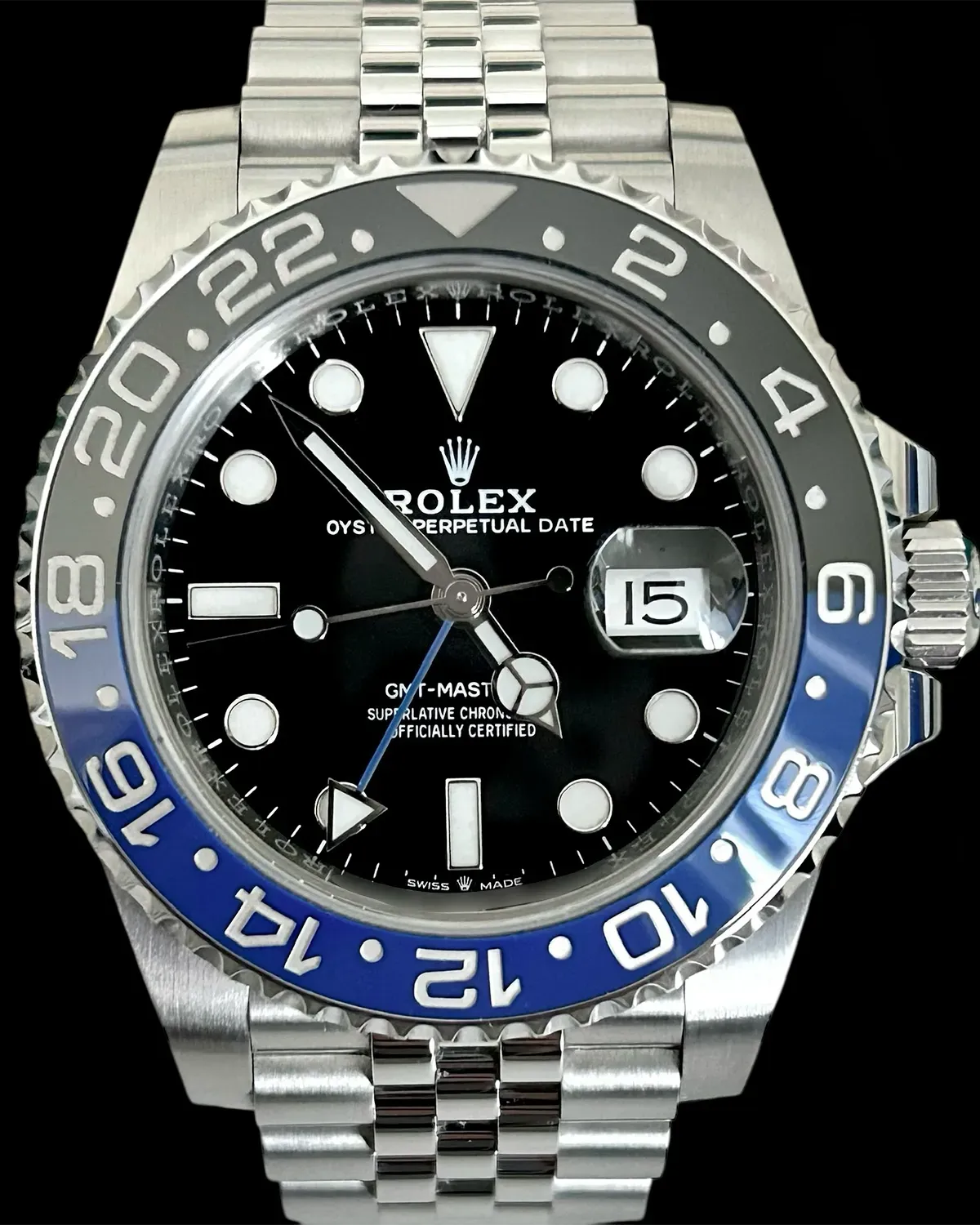 The 126710BLNR occupies a particularly desirable position in the pantheon of modern Rolex sports watches. What began as the “Batman” blue/black-bezel GMT-Master II (ref. 116710BLNR) in 2013 evolved in 2019 into the Jubilee-bracelet version, reference 126710BLNR — informally dubbed “Batgirl” by the collector community to distinguish the Jubilee bracelet variant. Rolex’s own spec sheet confirms that this model features a 40 mm Oystersteel case, black dial, and a bi-colour Cerachrom insert bezel in blue and black ceramic along with a 24-hour GMT hand and bidirectional rotating bezel for dual-time functionality. Over the years the “Batgirl” has emerged as a must-have for many enthusiasts for its blend of sport-watch utility, everyday wearability, and scarcity (especially in the earlier production years). The Jubilee bracelet gives this piece a distinctive, somewhat dress-sport feel that differentiates it from the Oyster-bracelet “Batman” version, and that variation has driven collector interest.