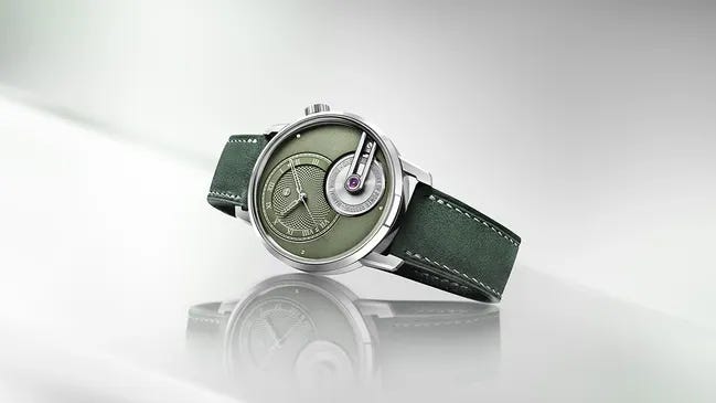 The Tribute 1 Green reinterprets Armin Strom’s modern dress watch with a vivid green dial and off-center time display. Its 38 mm steel case measures just 9.38 mm thick and features brushed and polished surfaces, plus an unconventional crown at 2 o’clock. The hand-wound AMW21 delivers an impressive 100-hour power reserve and crisp chronometric performance. Limited to 50 pieces, it blends artisanal guilloché touches with contemporary mechanics.