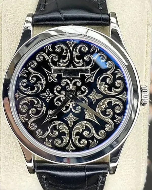 The Patek Philippe Calatrava Rare Handcrafts (5088/100P-001) features a 38mm platinum case with hand-engraved and black enameled flanks and a single diamond between the lugs at 6 o’clock, paired with a matching smooth bezel. Its hand-engraved and black enameled white gold dial presents an elegant design and a time only configuration sporting white gold dauphine-style hands. It is complemented by a leather strap fastened with a platinum buckle, for a classic and elegant fit. Bod now to add this exquisite Patek Philippe to your collection!
