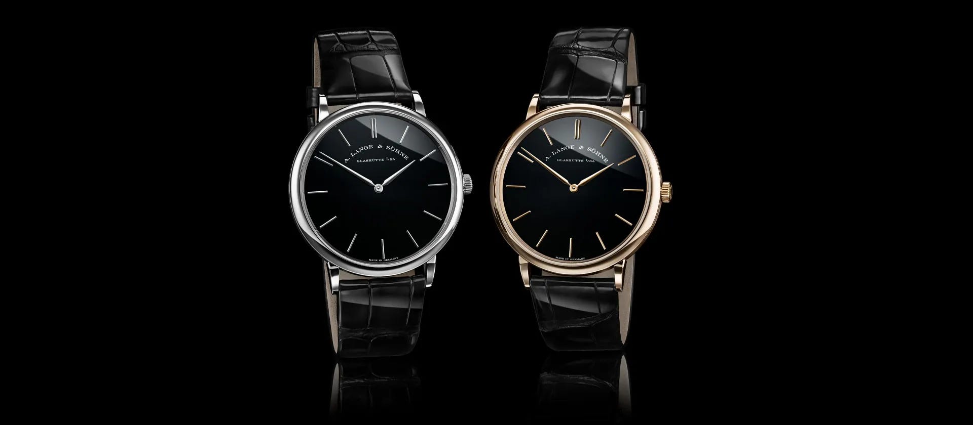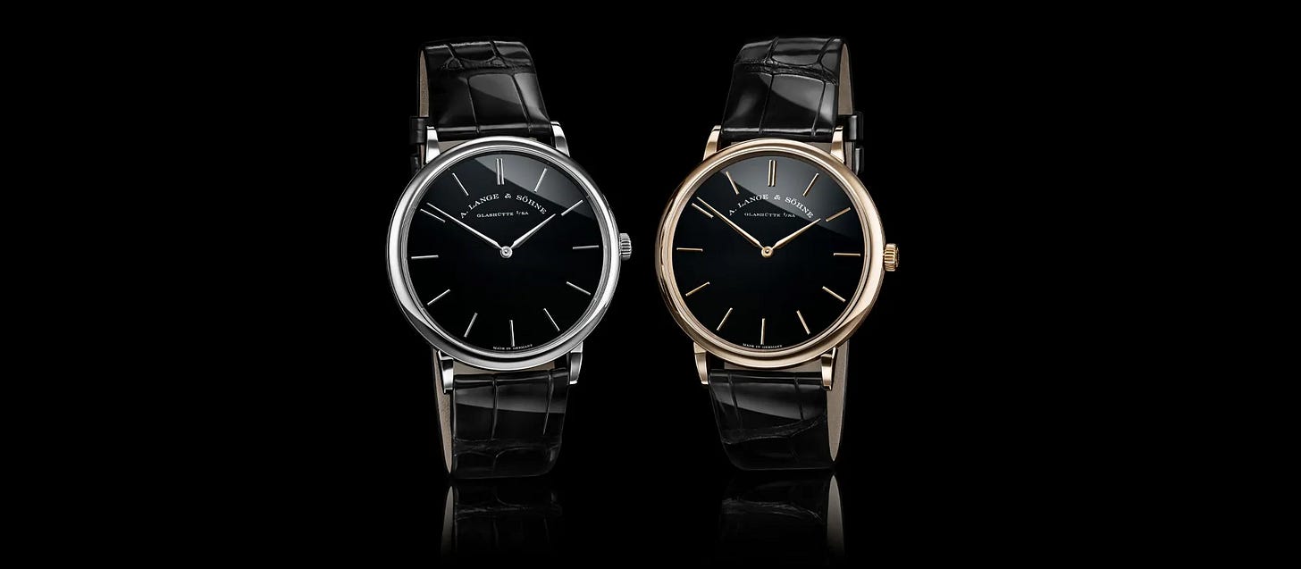 A. Lange & Söhne’s Saxonia Thin Onyx pairs a lustrous black onyx dial with an ultra‑slim 6.2 mm case in either honey gold or platinum. Inside is the hand‑wound calibre L093.1 with a 72‑hour power reserve, finished to the brand’s exacting standards. Gold hands and markers underscore the minimalist elegance, while the refined casework keeps the focus on proportion and poise. It’s a restrained, high‑craft dress watch that highlights Lange’s finishing and discipline.