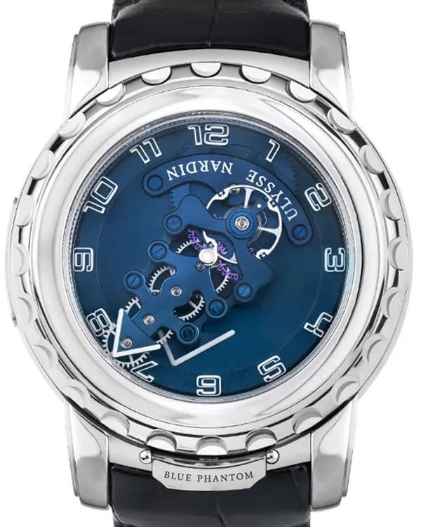 The auction closing Thursday evening, October 9, 2025, at 7:32 pm features a head-turning horological oddity: the Ulysse Nardin Freak “Blue Phantom” (Reference 020‑81). This listing includes the watch only—no box, no papers—and is represented by the seller as being in very good condition, a note that usually implies light signs of wear and no major cosmetic or mechanical defects. For collectors of the rare, the daring, or the mechanically bizarre, this is one worth watching.